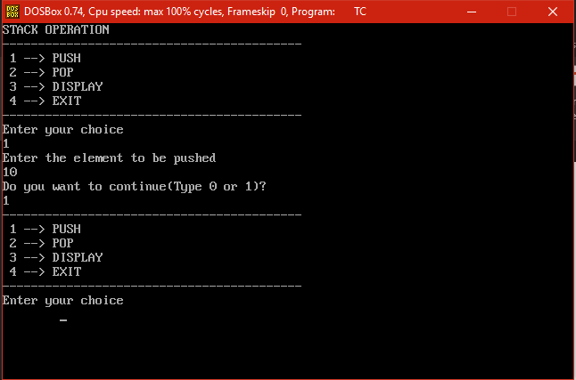 There are four options given to the user for executing the stack. They are Push, Pop, Display and Exit.